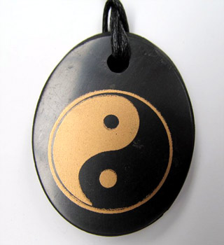 Šungitový přívěsek se zlaceným znakem jin - jang, velikost 3x4 cm, tl. 4 mm.